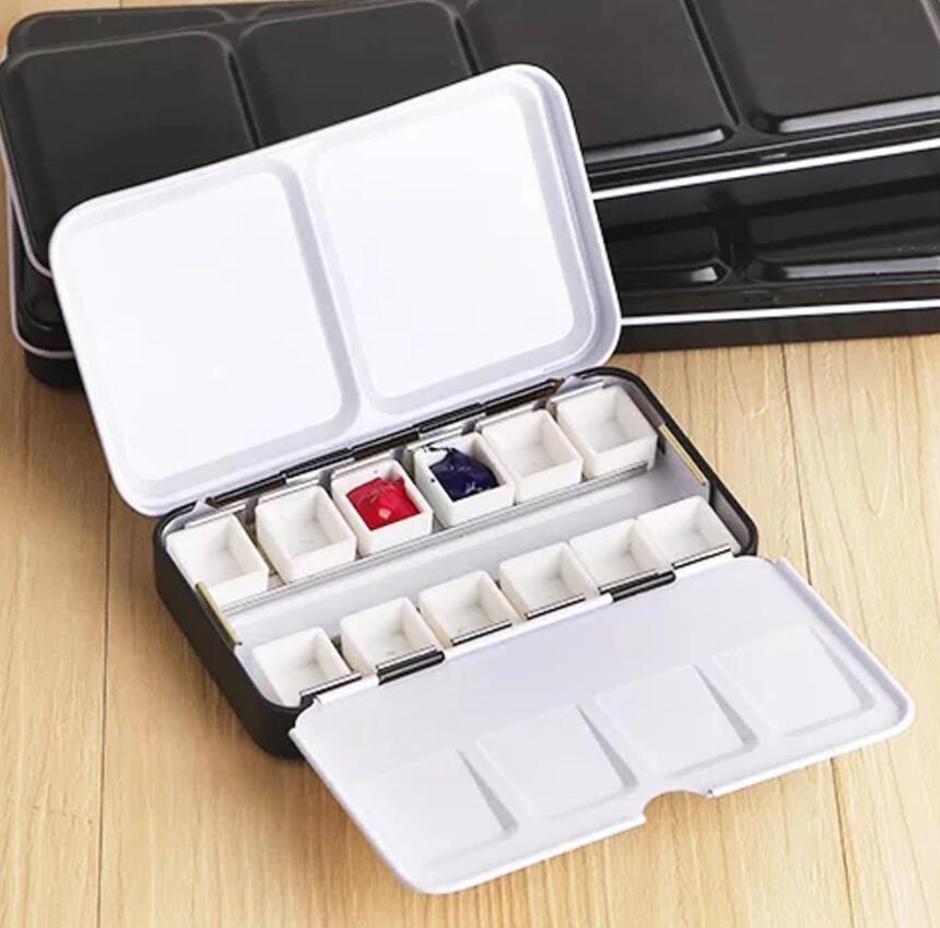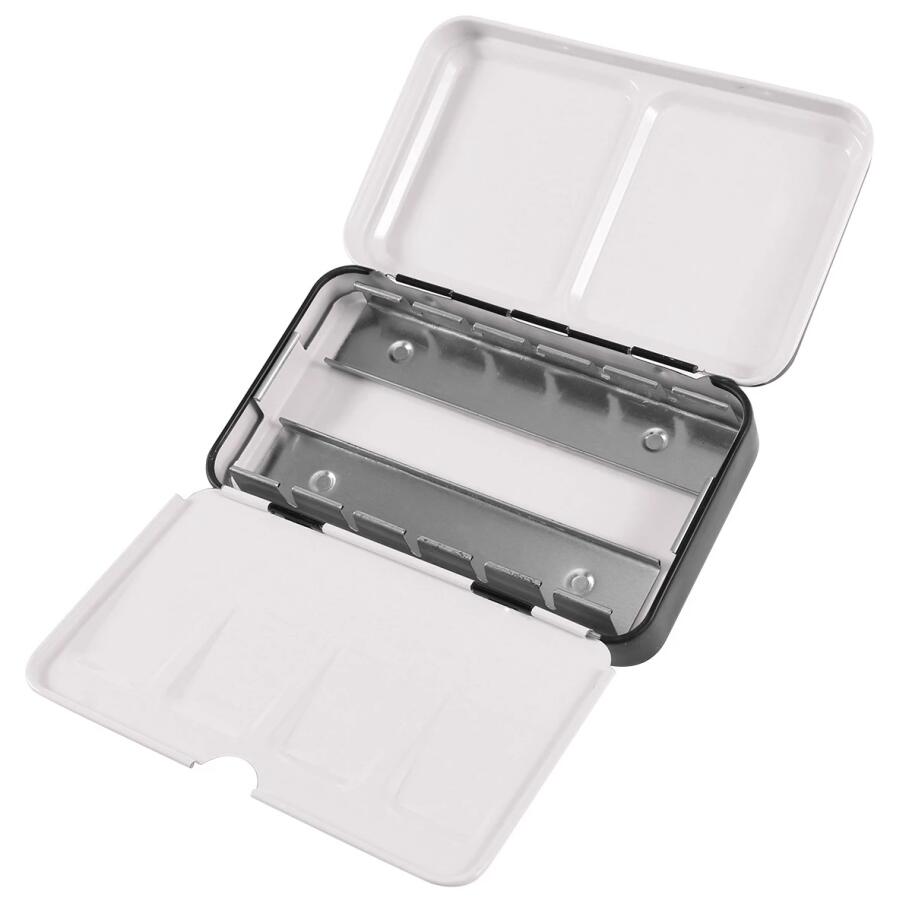 - A sturdy metal watercolor palette that holds 12 half-pans or 6 full-pans of watercolor paint. There is ample space to mix your colors in the mixing wells, and the pans are removable if you’d like to exchange colors at any point. A metal ring on the bottom of the palette lets you hold it sturdily in one hand while painting.